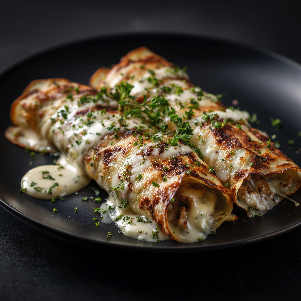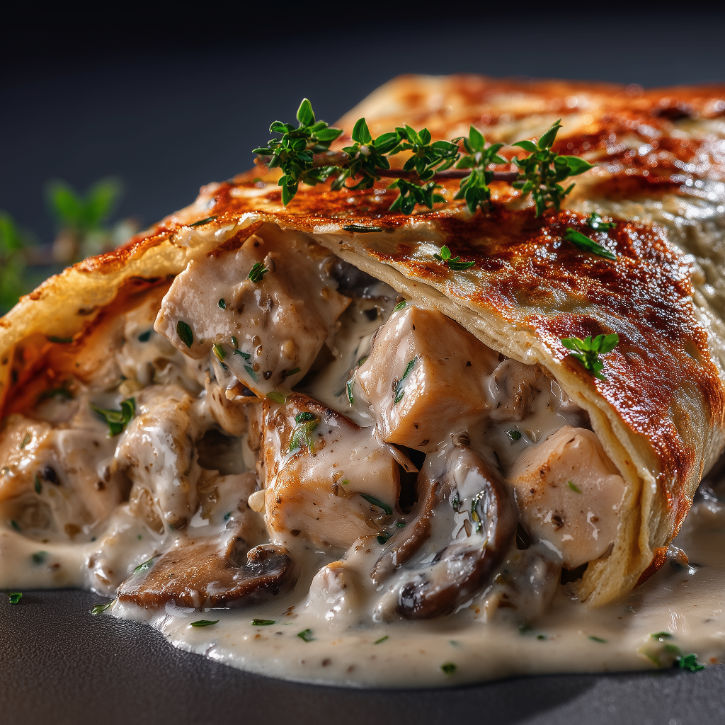 Clătită sățioasă, umplută cu piept de pui fraged și ciuperci alese, aromată cu condimente delicate și verdeață proaspătă, învelită într-o clătită subțire și rumenită uniform.