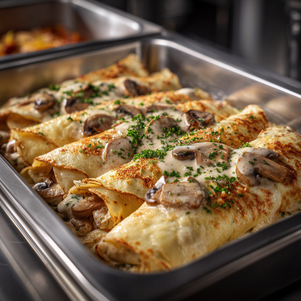 Clătitele noastre cu pui și ciuperci sunt concepute pentru bucătării profesionale care caută gust curat, prezentare îngrijită și timpi previzibili de servire. Umplutura este bazată pe piept de pui fraged, tăiat fin și tras scurt pentru a-și păstra suculența, completat de ciuperci alese, sotate cât să-și elibereze aroma fără exces de lichid. Condimentele sunt dozate delicat, iar verdeața proaspătă (pătrunjel/mărar, conform rețetarului) rotunjește profilul final: sățios, blând, constant între loturi, fără potențatori de aromă. Clătita este subțire, rumenită uniform, cu pete aurii discrete, suficient de elastică pentru a înveli umplutura și a păstra o tăietură curată la porționare.