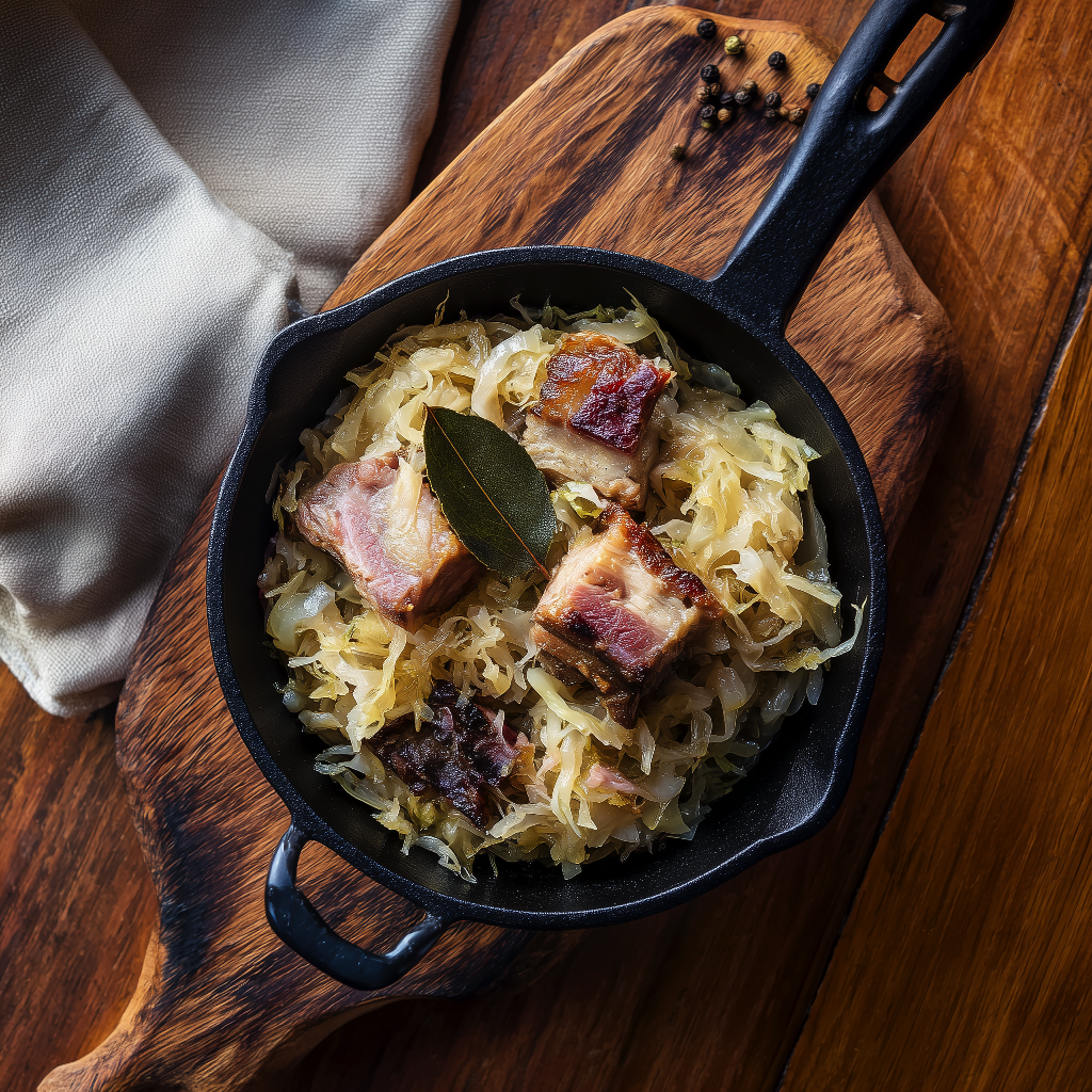 Varza noastră călită cu ciolan afumat este gândită pentru bucătării profesionale care urmăresc gust autentic, prezentare îngrijită și timpi previzibili de servire. Pornim de la varză murată atent desărată și călită lent până când fibrele devin fragede și capătă nuanțe aurii, cu margini ușor caramelizate. Ciolanul afumat este fiert/înebușit separat pentru a-și păstra suculența, apoi integrat în cantități echilibrate, astfel încât fiecare porție să aibă același raport carne–varză. Profilul este rotunjit cu condimente discrete (cimbru, foi de dafin, piper), pentru un gust bogat, echilibrat între dulceagul natural al verzei călite și nota plăcut afumată a cărnii. Rețetă curată, fără potențatori, cu aromă blândă și constantă între loturi.