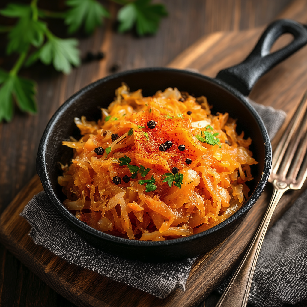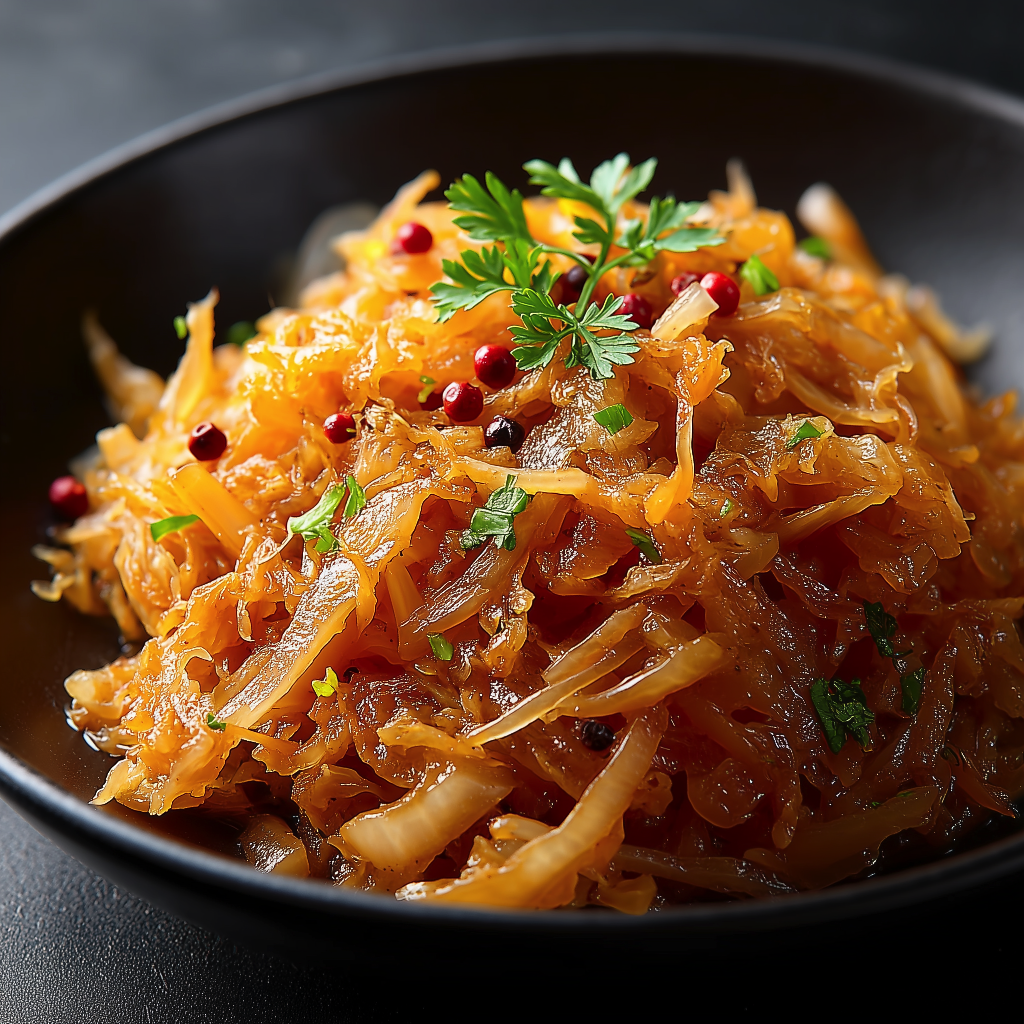 Varză murată călită aromată, cu textură fragedă și gust echilibrat între acrișor și dulceag, preparată cu ulei și condimente delicate.